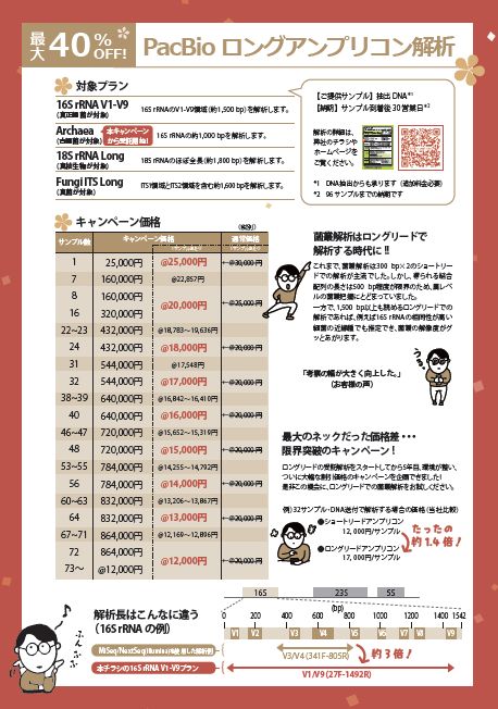 対象サービス:PacBioロングアンプリコン解析の4プラン(16S V1-V9プラン、Archaeaプラン、18S rRNA Longプラン、Fungi ITS Longプラン)