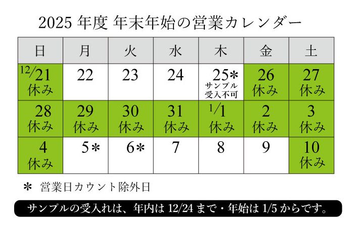 検体の受け入れは、年内は2025年12月24日(水)まで、年始は2026年1月5日(月)からとさせていただきます。